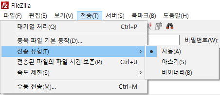 참고로 글씨가 있는 문서 종류는 아스키, 그림파일같은 종류는 바이너리 전송을 해야하기 때문에 복합적인 일반 업로드라면 자동으로 선택하는 것이 좋습니다.